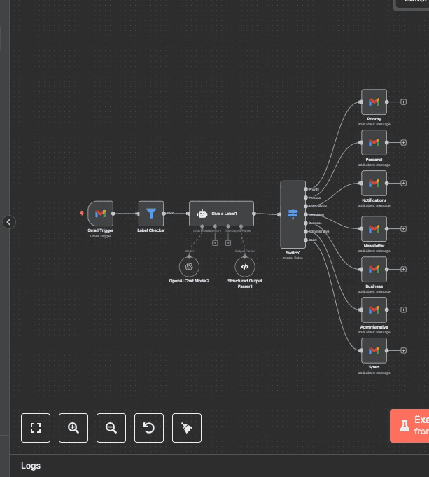 This project automated the process of sorting and labeling incoming emails by using an n8n workflow integrated with AI. The system categorizes emails into priority, personal, notifications, newsletters, business, administrative, and spam labels. By automating email management, the workflow reduces manual effort and improves inbox organization, making it easier to prioritize and respond to important messages.