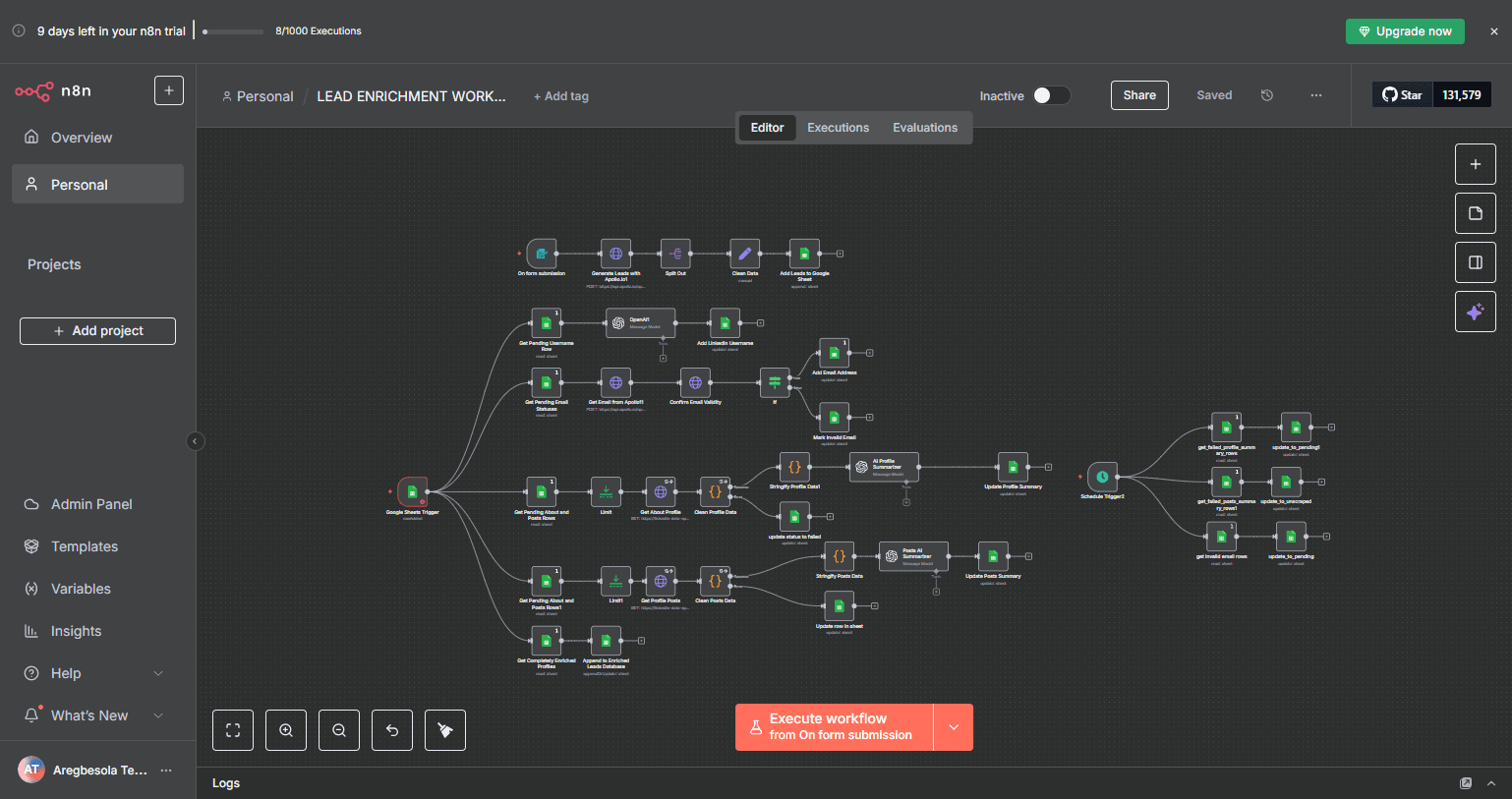 An n8n workflow was set up to trigger on form submissions and via scheduled Google Sheets checks. It gathers pending lead usernames and emails, enriches profiles by fetching data from Apollo.io and LinkedIn APIs, confirms email validity, and cleans incoming data. AI modules summarize profile and post data for quick insights. The workflow updates status flags and writes enriched and summarized data back to Google Sheets, enabling seamless tracking and management.