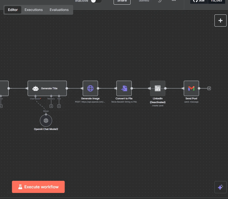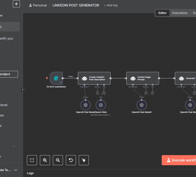 This project automated the creation and posting of LinkedIn updates using an n8n workflow integrated with AI-powered content generation and image creation. The workflow automatically generates post descriptions, image prompts, titles, and image files, culminating in posting directly to LinkedIn. The goal was to streamline LinkedIn content creation, saving time while maintaining engaging and high-quality posts.