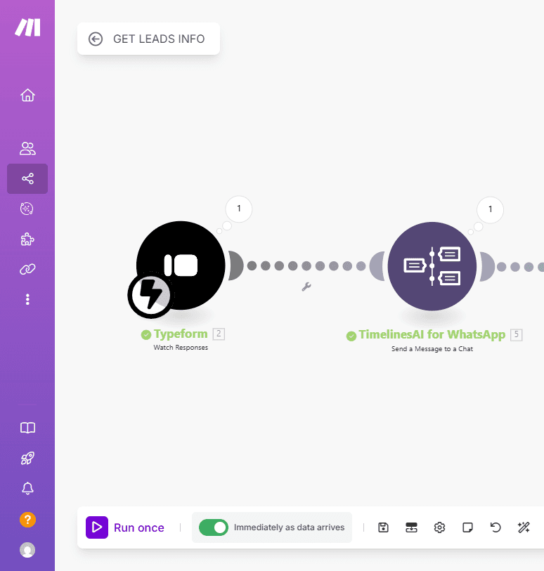 This automation outlines the creation of a fully automated lead capture and engagement system using Make.com (formerly Integromat). The workflow connects Typeform, TimelinesAI for WhatsApp, Google Sheets, and Gmail, streamlining the process of collecting lead data, initiating communication, and managing follow-ups without manual intervention.